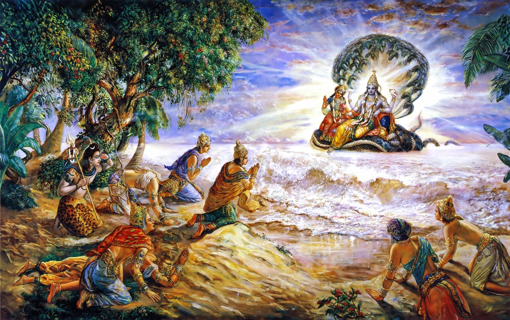 Thereafter Lord Brahma went with mother earth, Lord Shiva, and all the other demigods to the shore of the ocean of milk. There the demigods worshiped Lord Vishnu, the master of the universe, the supreme God of all gods, who provides for everyone and diminishes everyone's suffering. With great attention they worshiped Him by reciting the Vedic mantras known as the Purusa-sukta.