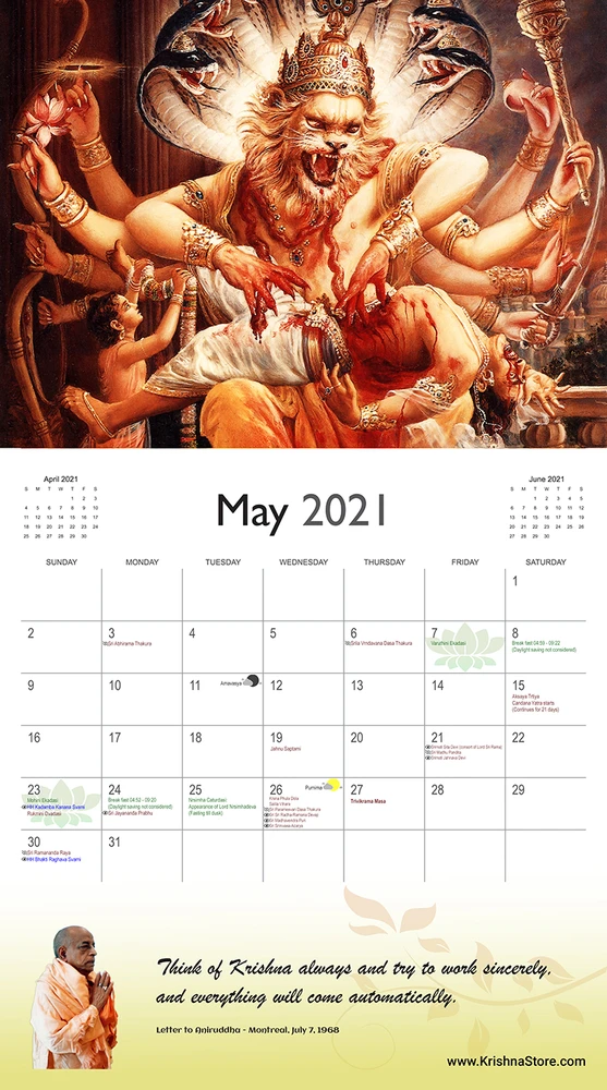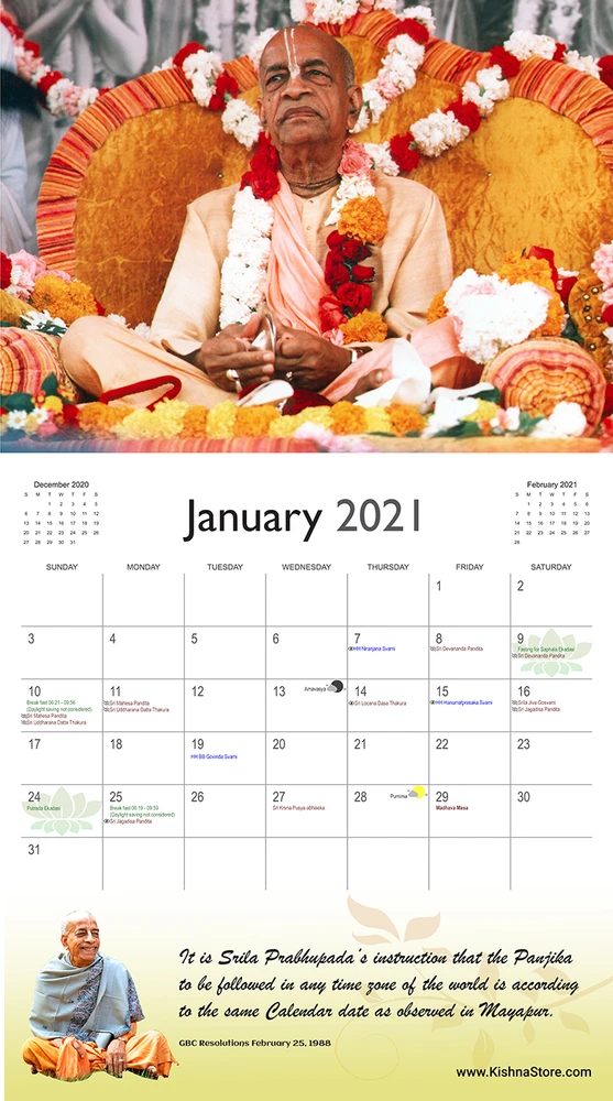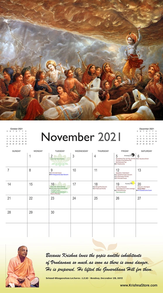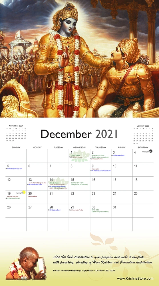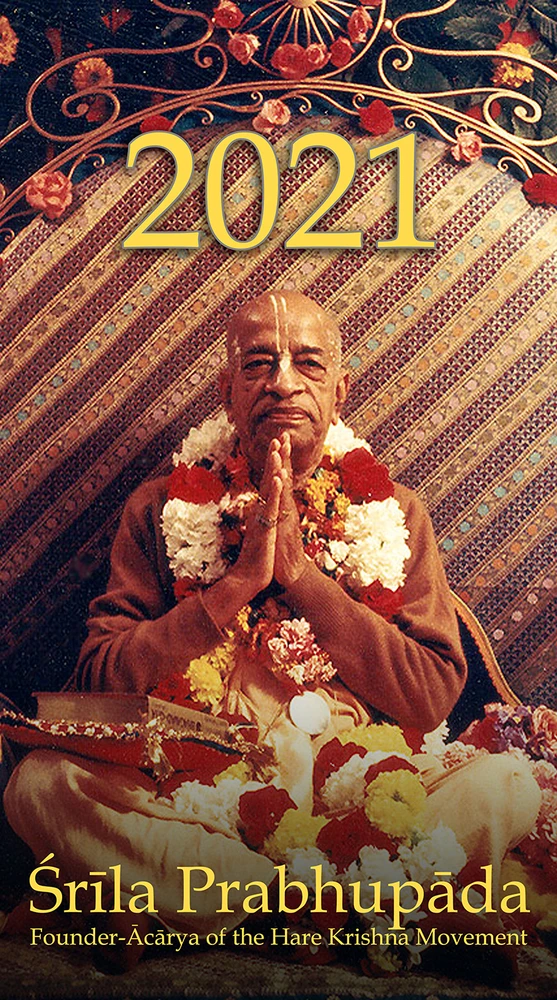 2021 Vaisnava Wall calendar. Has one page for main cover and one for each month of the year. Each month's page has a beautiful Krishna art painting on it along with an inspirational quote from the books and lectures of His Divine Grace A.C. Bhaktivedanta Swami Prabhuapda, the Founder-Acarya of the Hare Krishna Movement.