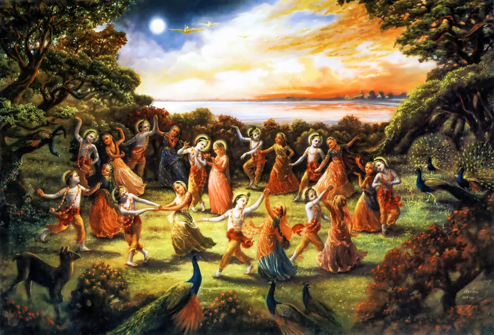 Kettledrums then resounded in the sky while flowers rained down and the chief Gandharvas and their wives sang Lord Krishna's spotless glories. A tumultuous sound arose from the armlets, ankle bells, and waist bells of the gopis as they sported with their beloved Krishna in the circle of the rasa dance. In the midst of the dancing gopis, Lord Krishna appeared most brilliant, like an exquisite sapphire in the midst of golden ornaments.