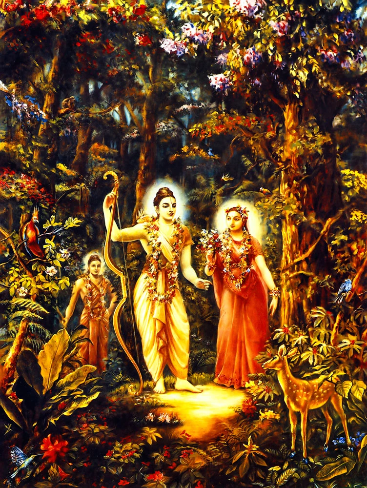 Because of his righteousness, King Dasaratha could not refuse the request of his wife. Thus the preparations that had been made for the coronation of Lord Rama were used for the coronation of Bharata, and Rama was banished to the forest. Out of love, Rama's consort, Srimati Sitadevi, accompanied Him, as did His younger brother Laksmana.