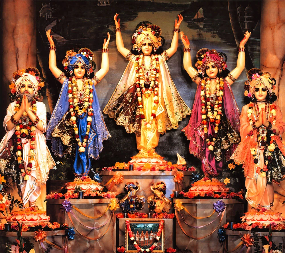 In the pastimes of Lord Caitanya, Krishna manifests in five features, known as the Panca-tattva. These Deities are Sri Advaita, Lord Nityananda, Lord Caitanya, Sri Gadadhara, and Srivasa.