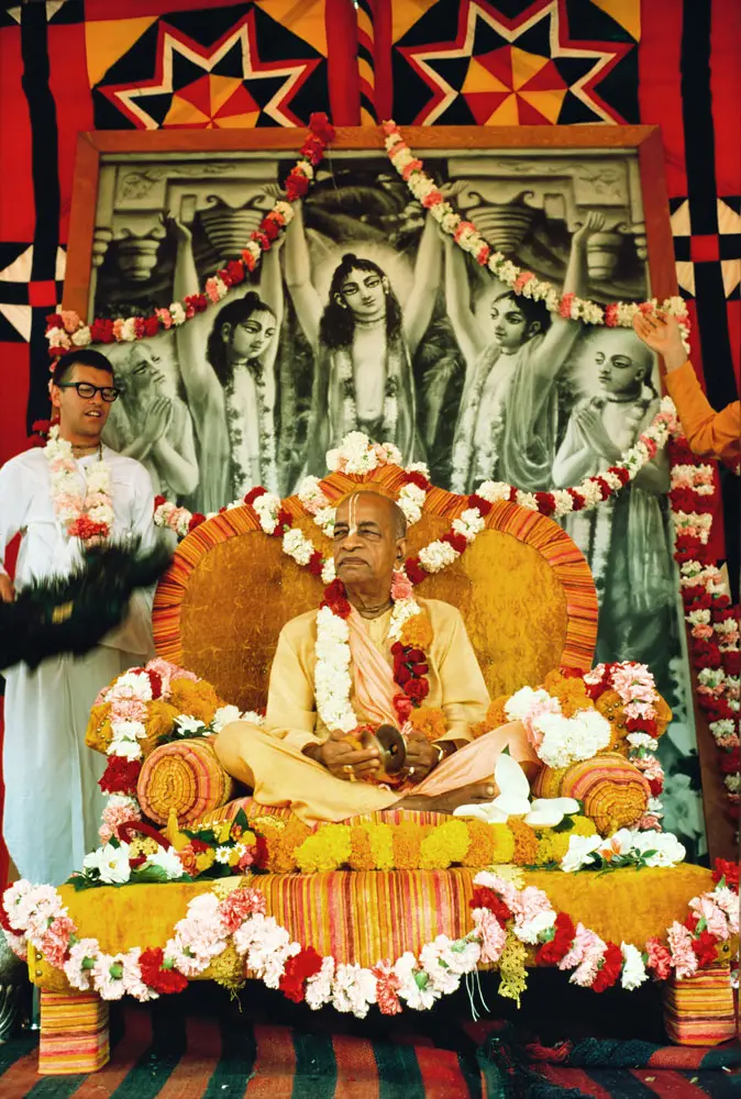 Srila Prabhupada at Rathayatra Festival Playing Kartals on Yellow Vyasasana in front of Big Panca-Tattva Painting