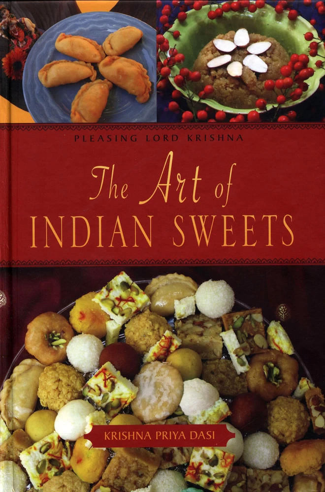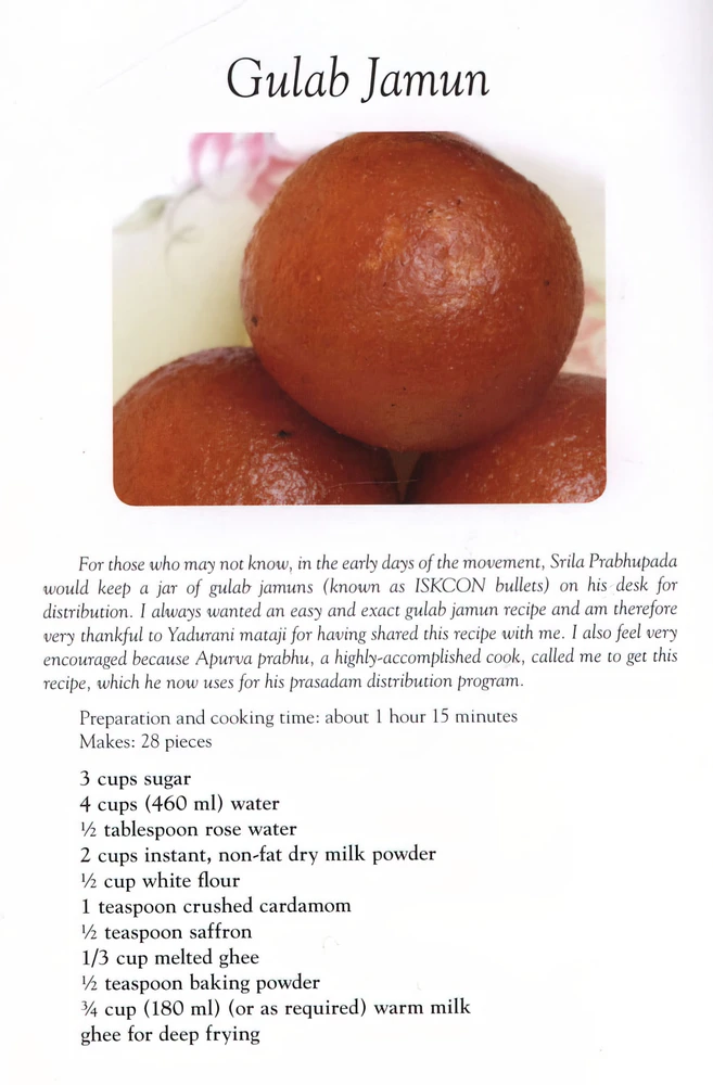 By Lord Krishna's and my spiritual master's arrangement, in 1996 I moved to New Goloka in Hillsborough, NC, USA after marrying Gopal Prabhu. Just a few days after my arrival one devotee asked me to help her roll besan laddu. It was my first time in the Deities' kitchen and I felt ecstatic. After that several devotees asked me to regularly help roll sweets for the Deities, Sri Sri Radha Golokananda. I so much desired to personally cook traditional Indian sweets for the Deities, especially sweets from Rajasthan, but it was difficult in the temple kitchen -- everything was huge. After a few months my husband hired someone to build a kitchen in my home which was suitable for my size and I was then able to make sweets as a regular service. I began to cook complicated Indian sweets and realized I needed to simplify the methods. From then on I started to write my own recepies. I recieved a lot of appreciation and encouragement from the devotees and visitors but I never thought I would write a cookbook.