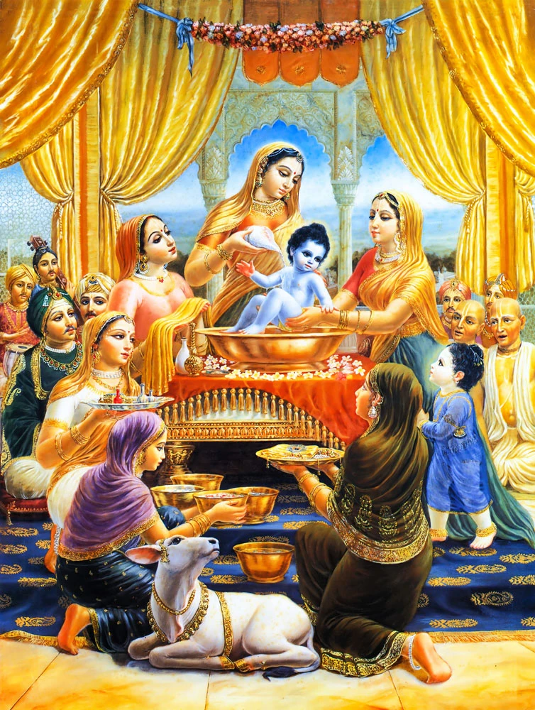 With their lotuslike faces looking extraordinarily beautiful, decorated as they were with saffron and fresh kukuma, the wives of the cowherd men hurried to the house of mother Yasoda with presentations in their hands. Offering blessings to the newborn child, Krishna, the wives and daughters of the cowherd men said, "May you become the King of Vraja and long maintain all its inhabitants." Then they sprinkled a mixture of turmeric powder, oil, and water upon the birthless Supreme Lord and offered Him prayers.