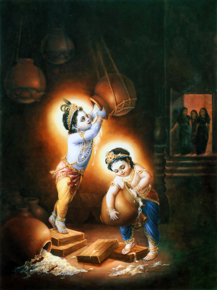 So we think that you'd better take all the jeweled ornaments from the bodies of your children." On hearing this, Yasoda would say, "All right, I will take all the jewels from Krishna so that He cannot see the butter hidden in the darkness." Then the gopis would say, "No, no, don't do this. What good will it do to cake away the jewels? We do not know what kind of boys these are, but even without ornaments They spread some kind of effulgence so that even in the dark They can see everything."
