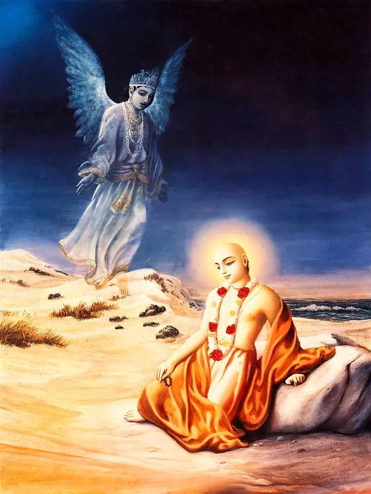 In a spiritual body resembling a Gandharva's, Junior Haridasa, although invisible, would sing at night for Lord Caitanya to hear. No one but the Lord knew of this.