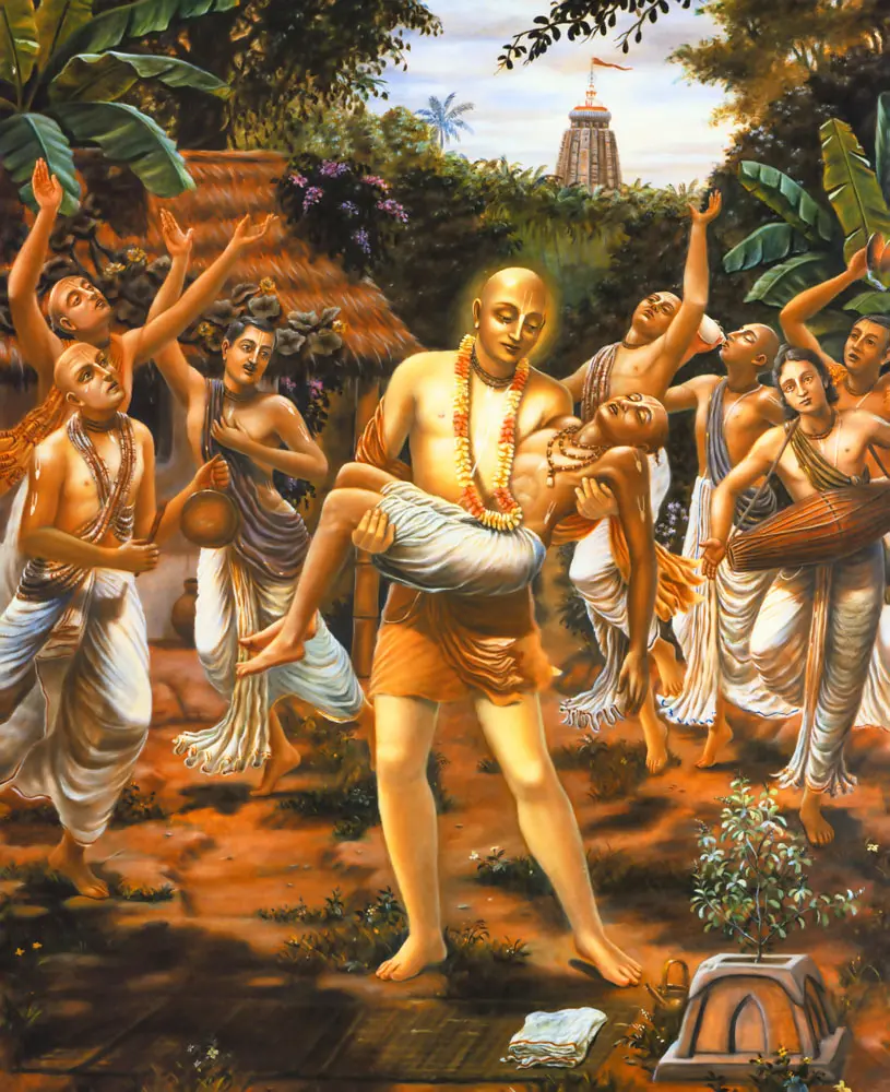 Sri Caitanya Mahaprabhu gave this benediction: "Anyone who has seen the festival of Sri Haridasa Thakura's passing away, anyone who has chanted and danced here, anyone who has offered sand on the body of Haridasa Thakura, and anyone who has joined this festival to partake of the prasadam will achieve the favor of Krishna very soon."