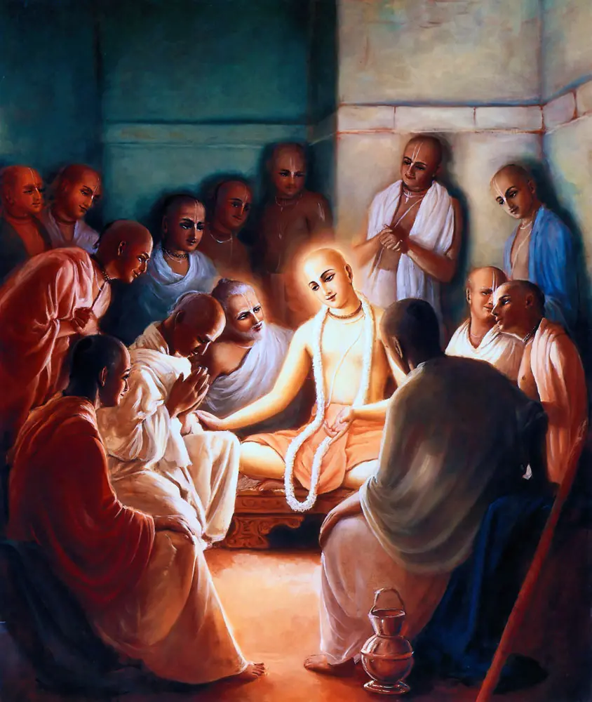 Since the residence of Kasi Misra was insufficient, all the assembled devotees were very overcrowded. Lord Caitanya made all the devotees sit at His side, and with His own hand He offered them garlands and sandalwood pulp.