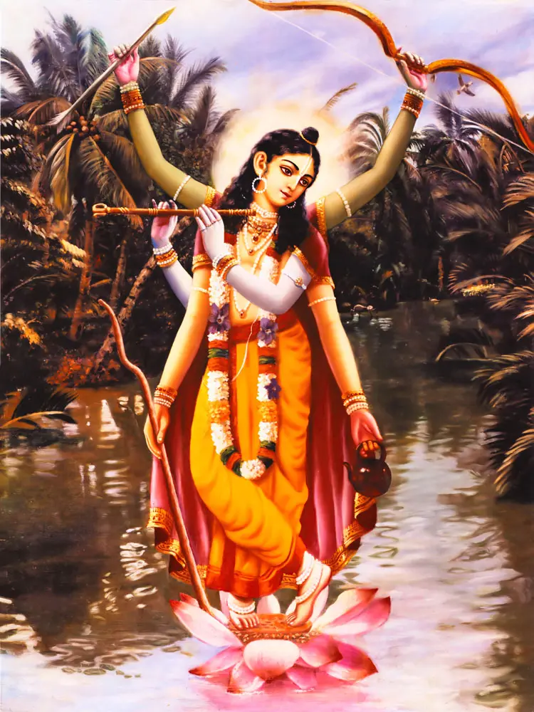 Lord Caitanya appreciated the humility of this great scholar and therefore exhibited His own form, first with four hands, and then with six hands (sad-bhuja). The six-armed form which Lord Caitanya disclosed to Sarvabhauma Bhattacarya had two hands of Lord Ramacandra, two hands of Lord Krishna and two hands of Lord Caitanya.