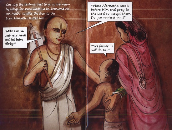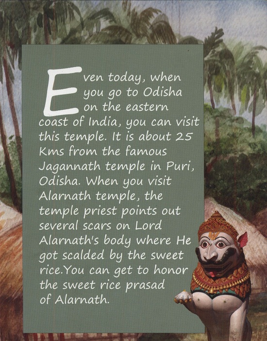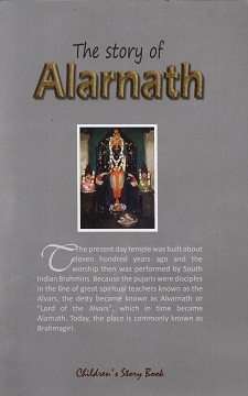 "The present day temple was built about 1,100 years ago and the worship them was performed by South Indian Brahmins. Because the Pujaris were disciples in the line of great spiritual teachers known as the Alvars, the deity because known as Alvarnatha or "Lord of the Alvars", which in time became known as Alarnath. Today, the place is commonly known as Brahmagiri." (Back cover)