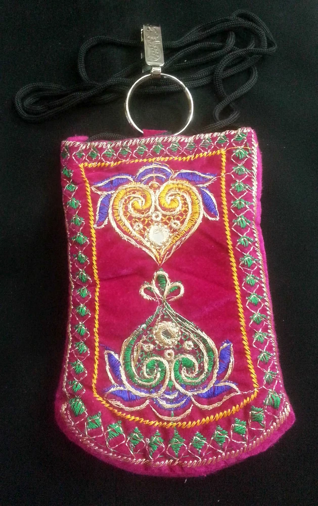 Beautiful velvet cloth pouch suitable for carrying mobile phone in. With attractive embroidery. Various colors and patterns. May be different from product image.