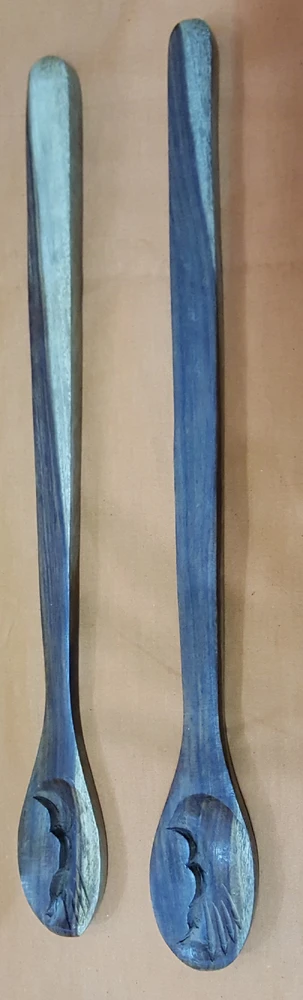 Set of two wooden spoons for use in fire yajnas. They are used for spooning in the ghee and other purposes. Approximately 15" long.
