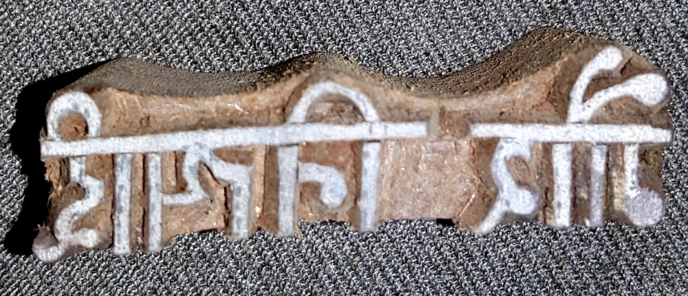 Wooden stamp with "Jaya Jagannatha" engraved on it in the Sanskrit Devanagari script. Length is 3 inches.